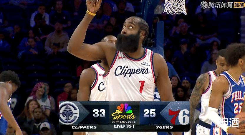 哈登打满首节,9投5中,砍下17分2篮板2助攻,带队一度取得13分领先优势。