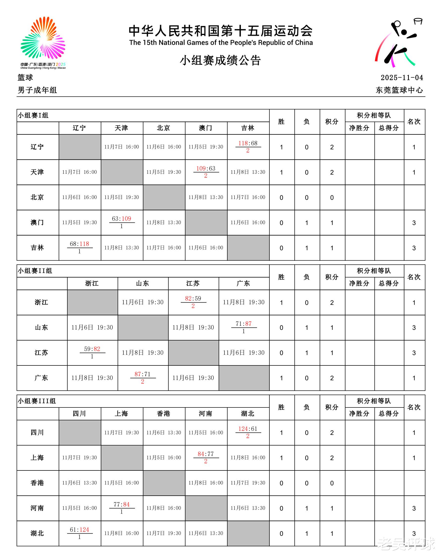 第一组,辽宁全运男篮118-68大胜吉林全运男篮,天津全运男篮109-63大胜澳门全运男篮。北京全运男篮轮空。