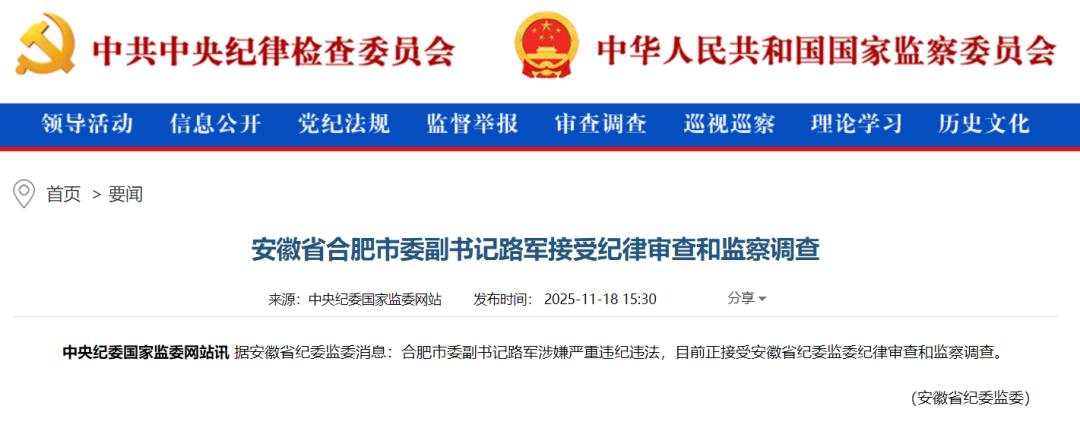 据安徽省纪委监委消息:合肥市委副书记路军涉嫌严重违纪违法,目前正接受安徽省纪委监委纪律审查和监察调查。