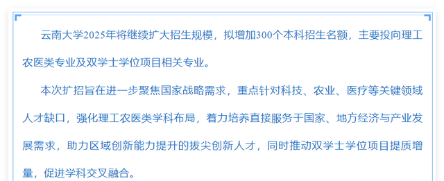 这次扩招中的另一个亮点是区域高校的“逆袭”。云南大学、湖南大学、西安交通大学等高校的扩招计划同样充满诚意。比如云南大学新增的理工农医类专业,直接对接地方经济和产业需求。这意味着,未来区域特色专业将成为高考志愿的“香饽饽”。毕竟,随着中西部地区经济的快速发展,越来越多的高校开始紧扣区域需求,培养本地化、定制化的人才。对于那些有志于留在家乡发展的考生来说,这无疑是一个好消息。
