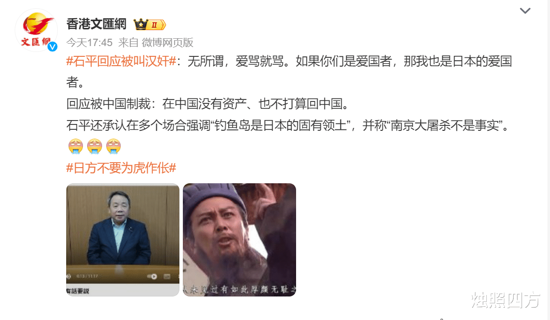 所谓“石平回应被叫汉奸”视频,我觉得,本质上,是石平“出口转内销”的操作,表面上看是回应中国对其的看法,实质上是向日本国内展示自己的态度,树立自己的政治形象。另外,我还认为,石平能以日籍华人身份当选日本国会议员,也证明了石平确实是个相当有手腕儿的人。我其实好奇,他的心路历程,作为一个“人才”为何会跑到日本。当然,对于石平这一类人,只有中国国力全方位碾压日本,才能真正让他们明白,自己选错了。
