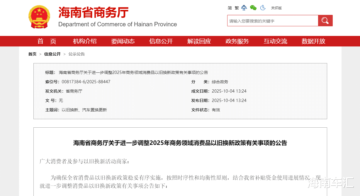 10月4日,海南省省商务厅发布《关于进一步调整2025年商务领域消费品以旧换新政策有关事项的公告》(以下简称《公告》),进一步调整消费品以旧换新政策。