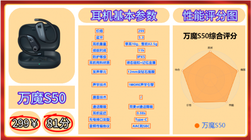 第四款推荐、万 魔 S 5 0 | 参考价:299元 | 蓝牙5.3