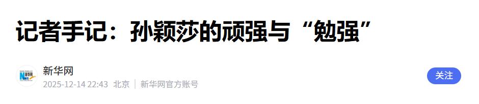 12月14日,新华社发布一篇名为《孙颖莎的顽强与“勉强”》的文章。