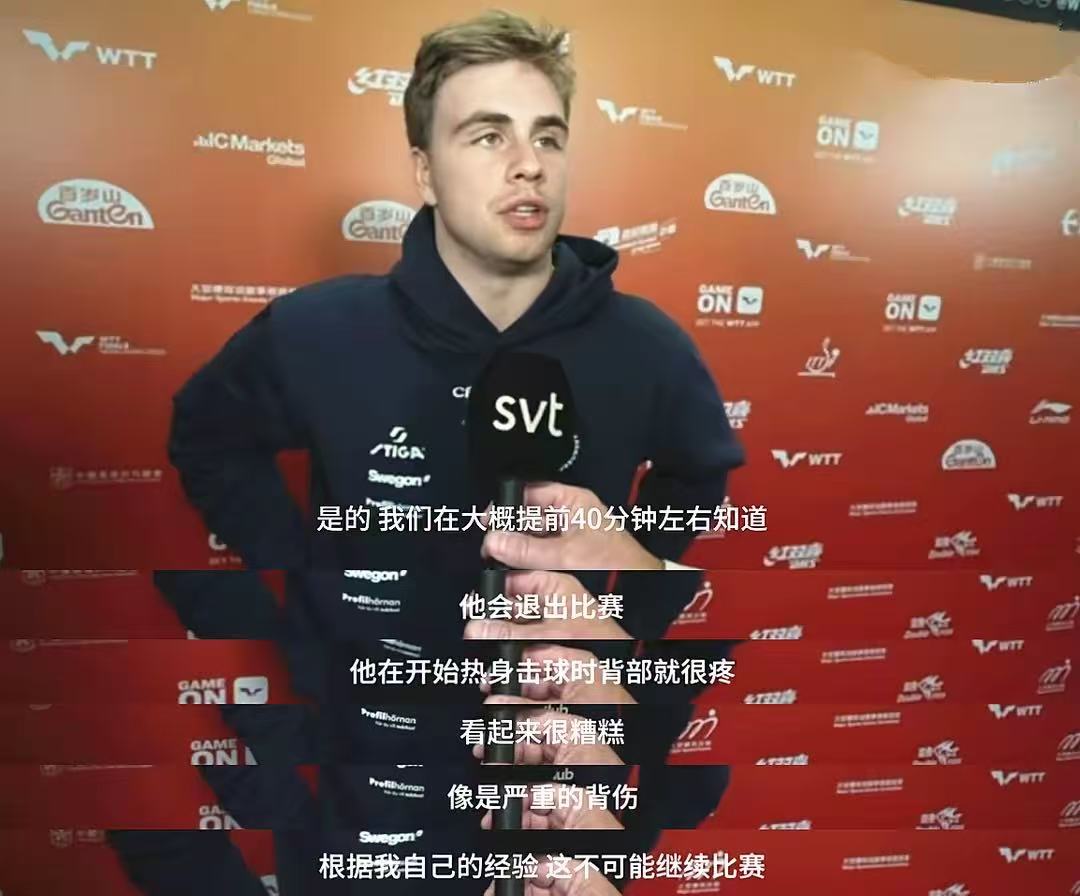 在赛后的采访中,莫雷加德表示王楚钦在赛前就发现了腰部的问题。
