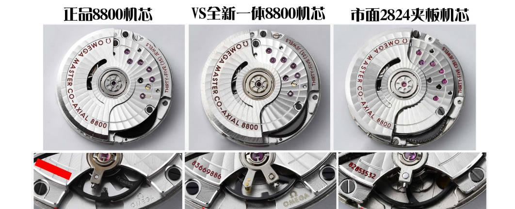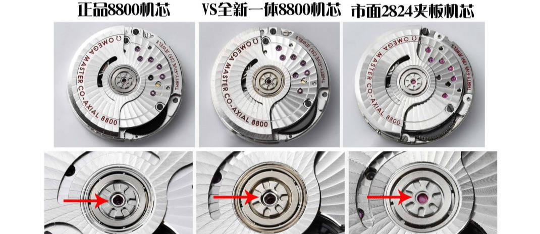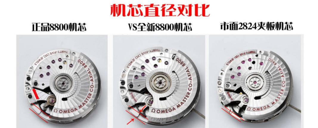 vs全新8800一体机芯直径和正品一样(都是26.50MM),而2824的直径仅为25.9MM,比正品机小0.6MM,再加上2824摆轮直径明显比正品大这样显得摆轮位置比正品机明显靠外面很多,如上面箭头所示。