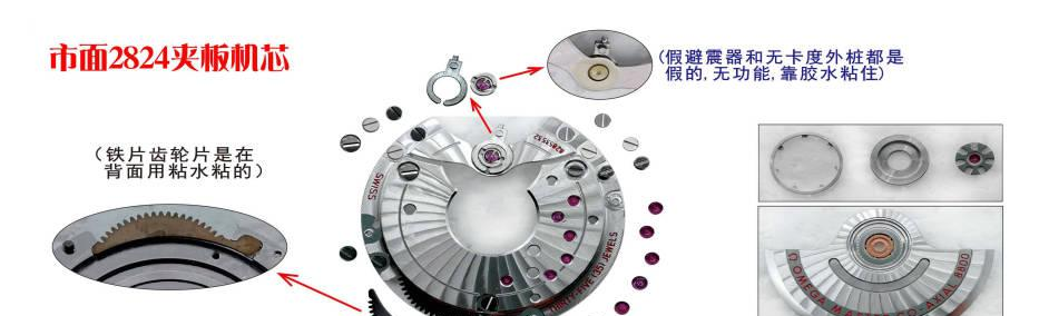 市场2824夹板机芯用2824机芯加盖子夹板做法,有个致命的端,因为它夹板上所有齿轮,宝石,螺丝钉,外桩,避震器这些小配件都是假的,全部是靠胶水黏上去的,胶水没有粘好或是很长一段时间,很容易脱落,造成机芯故障,手表不能正常佩戴。
