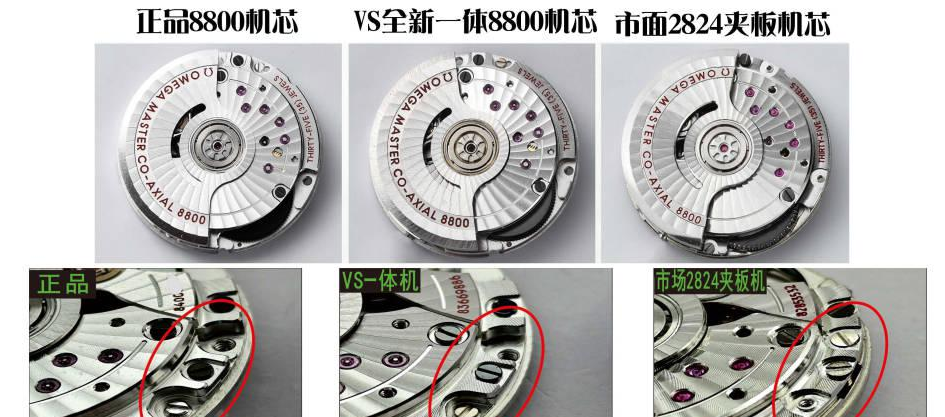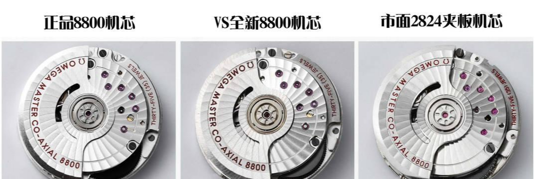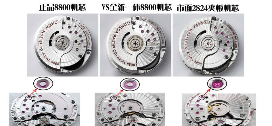 VS全新8800一体机芯所有宝石中间都是齿轮轴的,并且和正品机一样,都是有真功能的,而且宝石颜色和正品机一样。而市场2824夹板机上所有的夹板的宝石中间都是没有齿轮轴的,假的,没有真功能,而且颜色也比正品机颜色艳很多,区别比较明显。