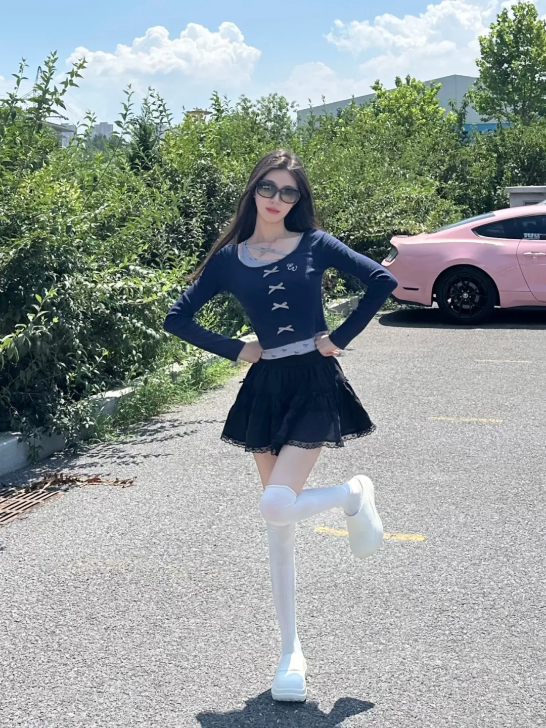 黑色的裙是一场小型的狂欢,蓬蓬的裙摆像未说出口的欢闹,蕾丝边是最细腻的注脚。它轻轻晃着,把少女的俏皮抖落在沥青路上,每一层褶皱里都藏着对甜的注解。长度刚刚好,让腿的线条成为行走的风景,却又不刻意袒露,像给青春的莽撞套上一层温柔的壳,甜得克制,甜得有分寸。
