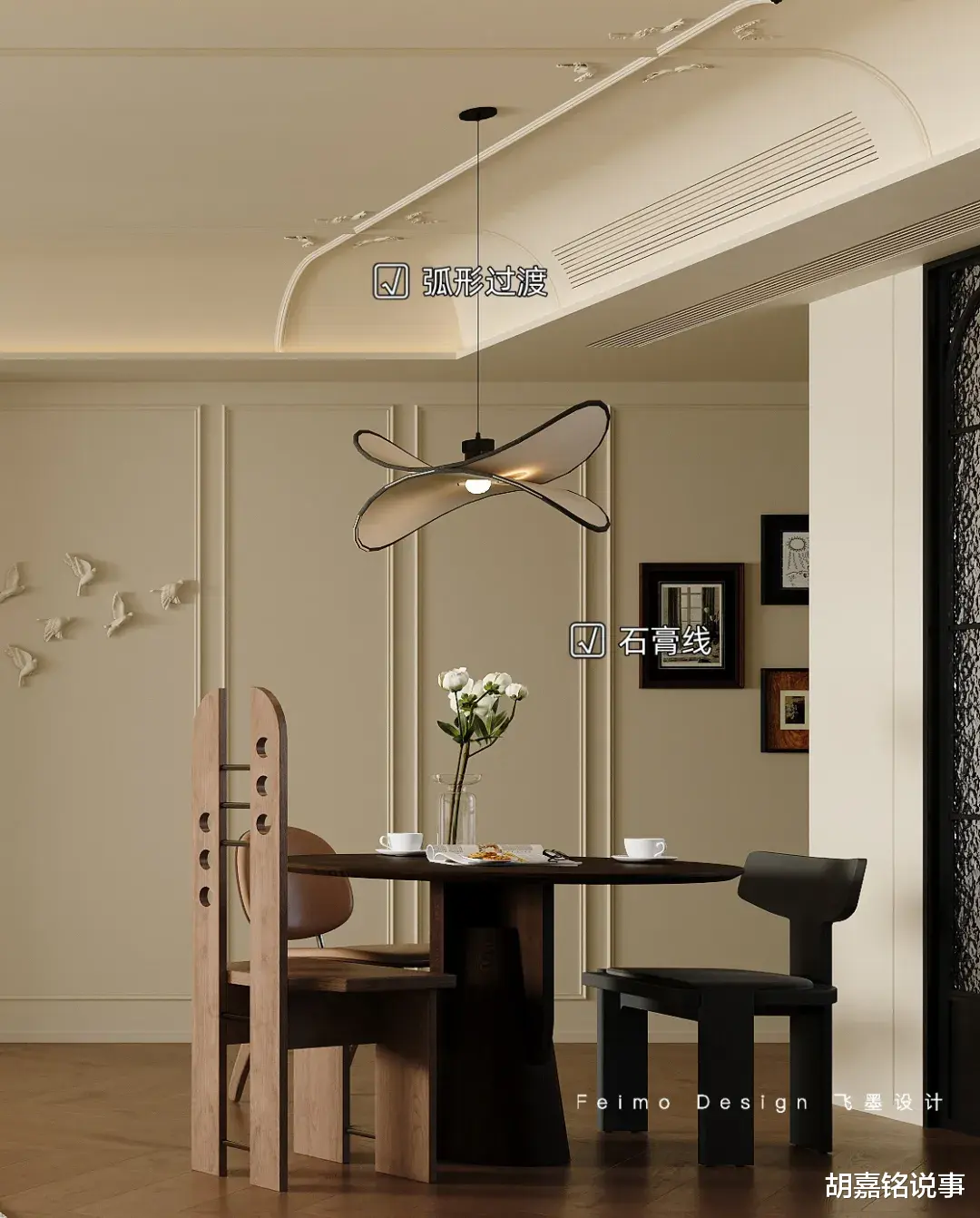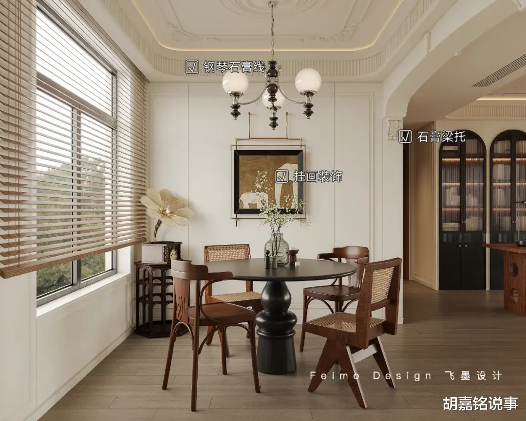 设计亮点:①餐厅墙面设计护墙板+挂画装饰。②餐厅与客厅之间设计拱形门+石膏梁托装饰。