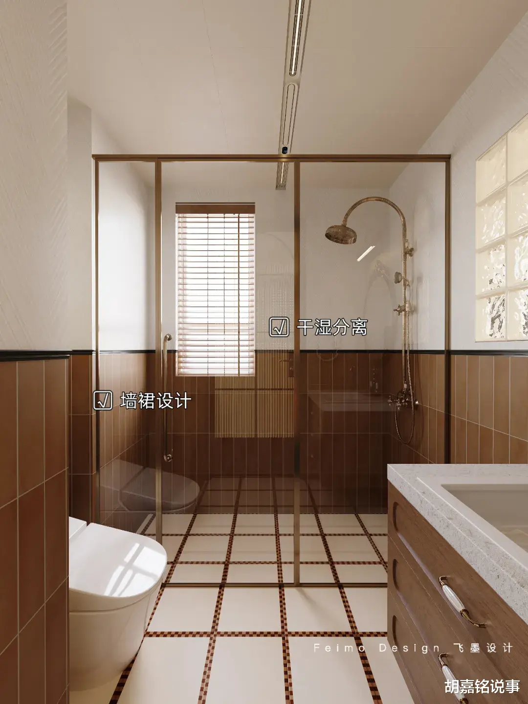 设计亮点:①主卫用淋浴房做干湿分离,好打理,也更好用。②选择两种颜色的瓷砖,设计墙裙,提升设计层次感。