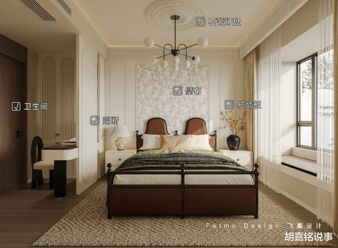 设计亮点:①床头背景墙设计护墙板+壁布装饰。②床尾定制一整排柜体,并设计拱形线条装饰。