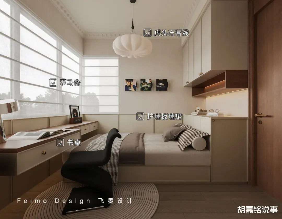 ●设计亮点:另一间次卧,定制收纳柜+榻榻米床+书桌+护墙板墙裙,空间利用率最高。根据业主的需求,结合房屋的情况,私人定制设计,让房屋有舒适也有个性~