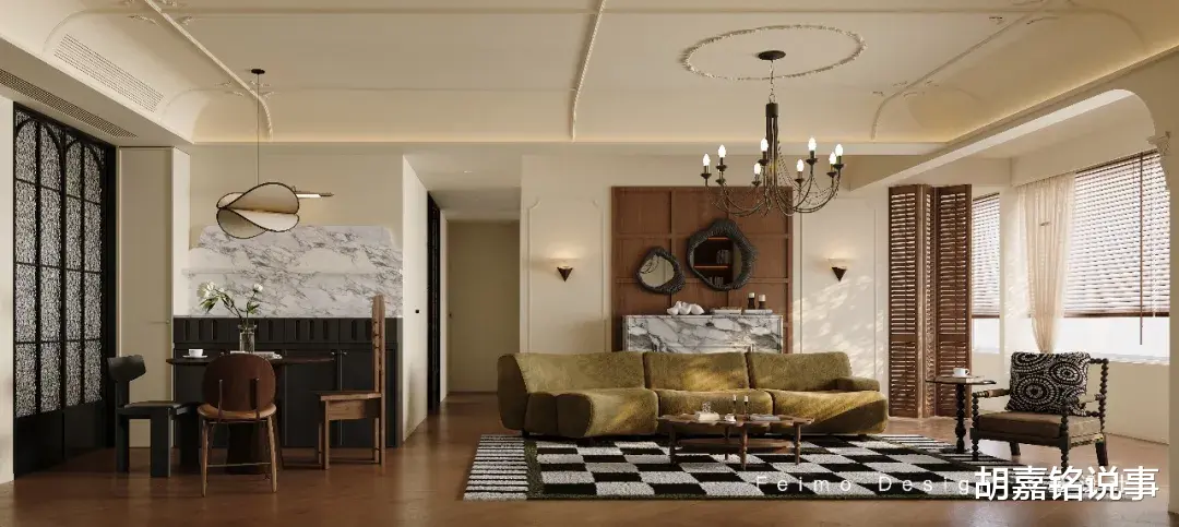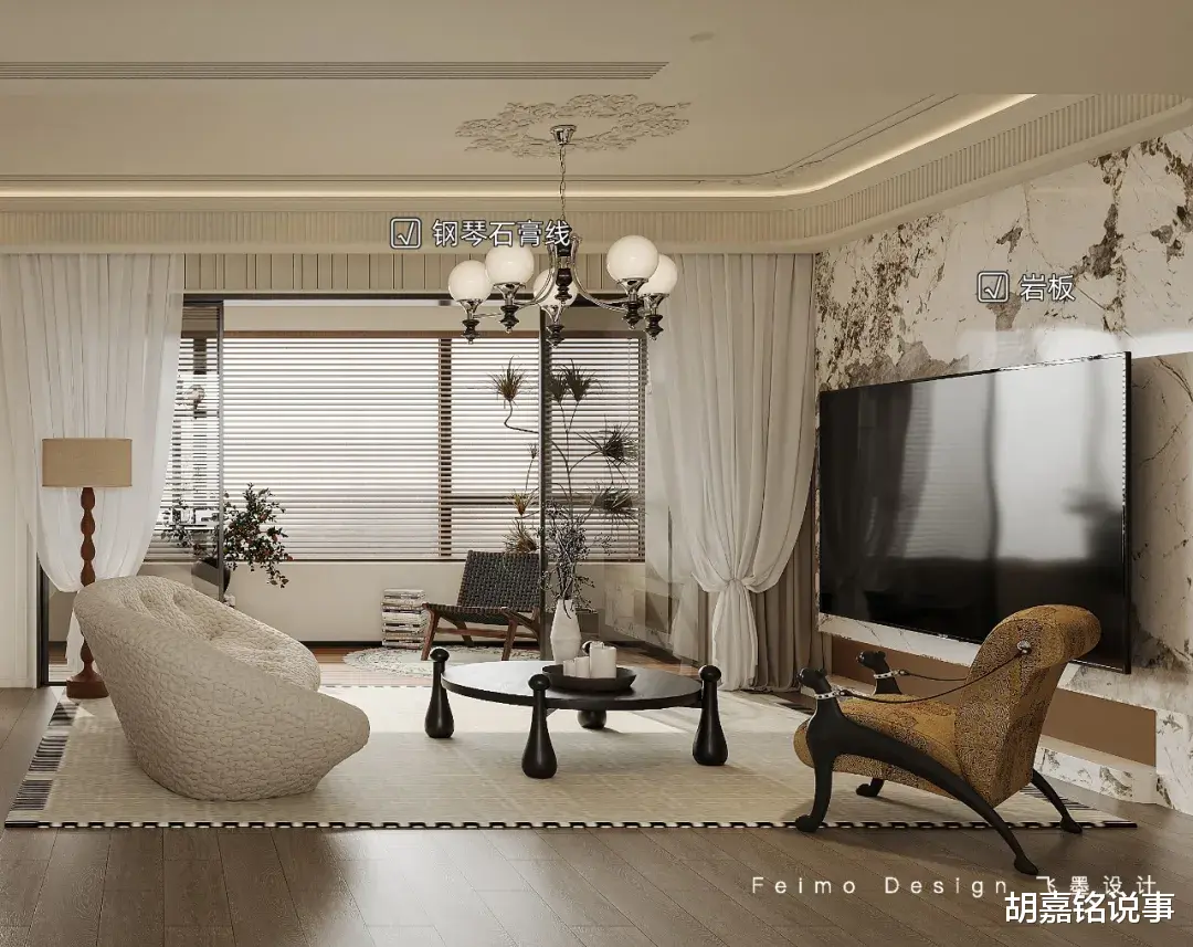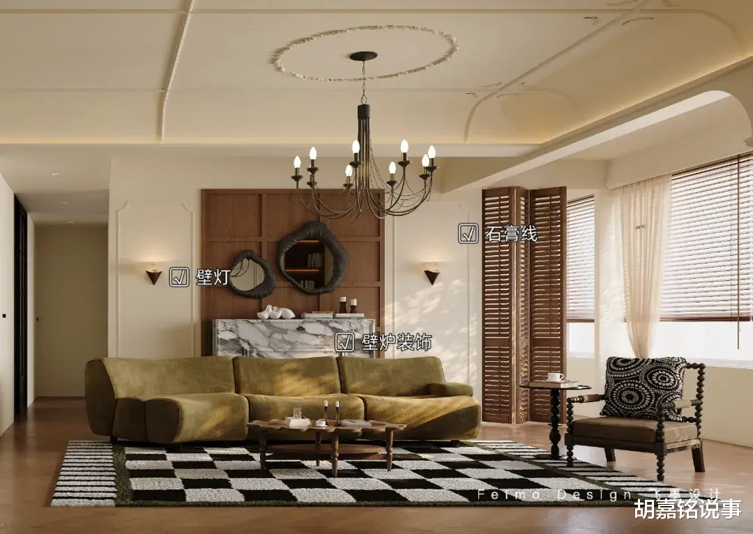 ③沙发墙设计石膏线、护墙板、壁炉装饰,提升家居精致度。