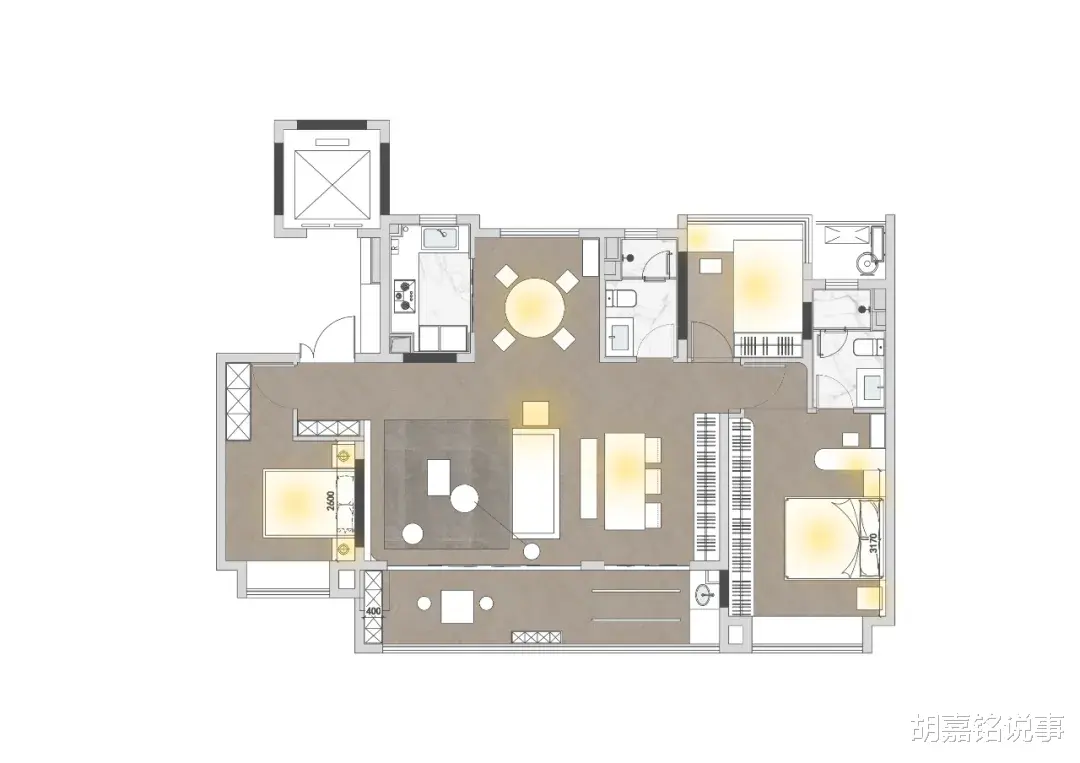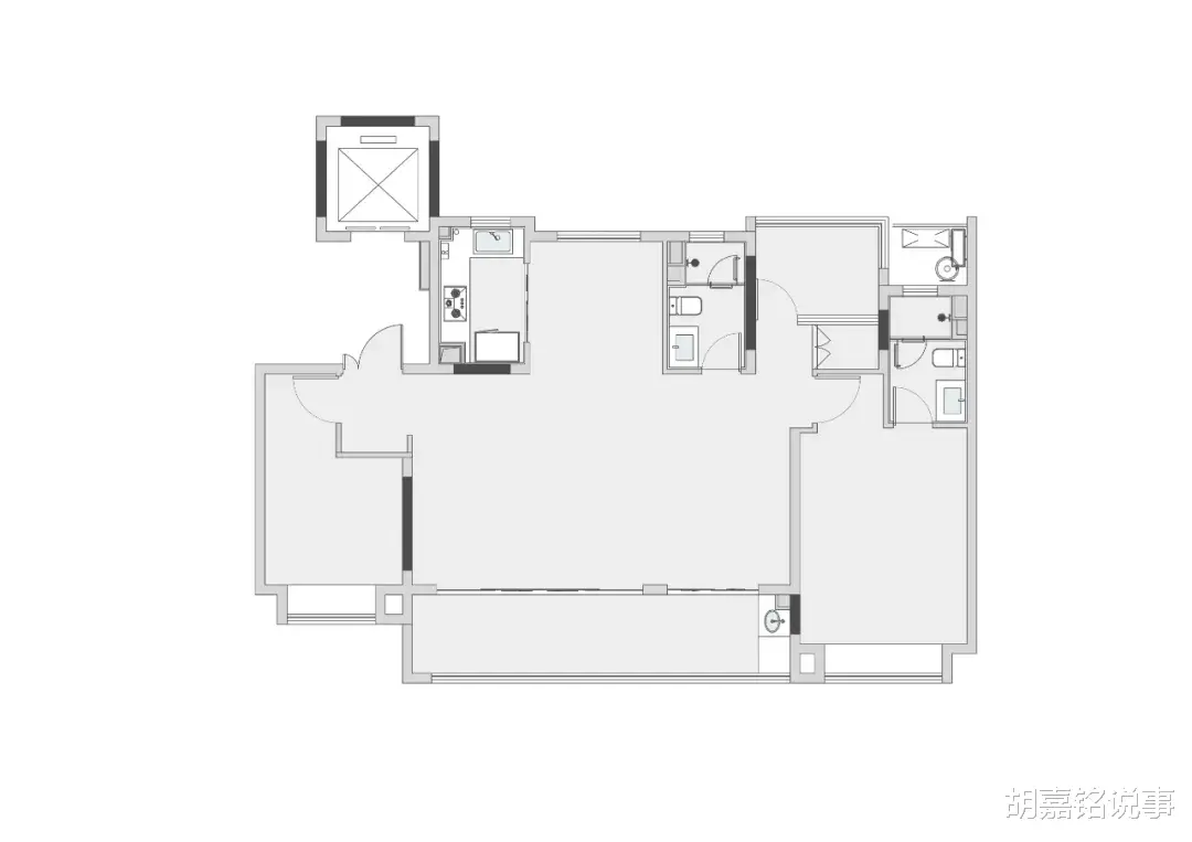 设计改造:①横厅划分部分空间给主卧,设计衣帽间。②同时与衣帽间相邻的阳台部分,设计为独立家政区。③保留两个卧室,一间卧室设计书房+墨菲床。