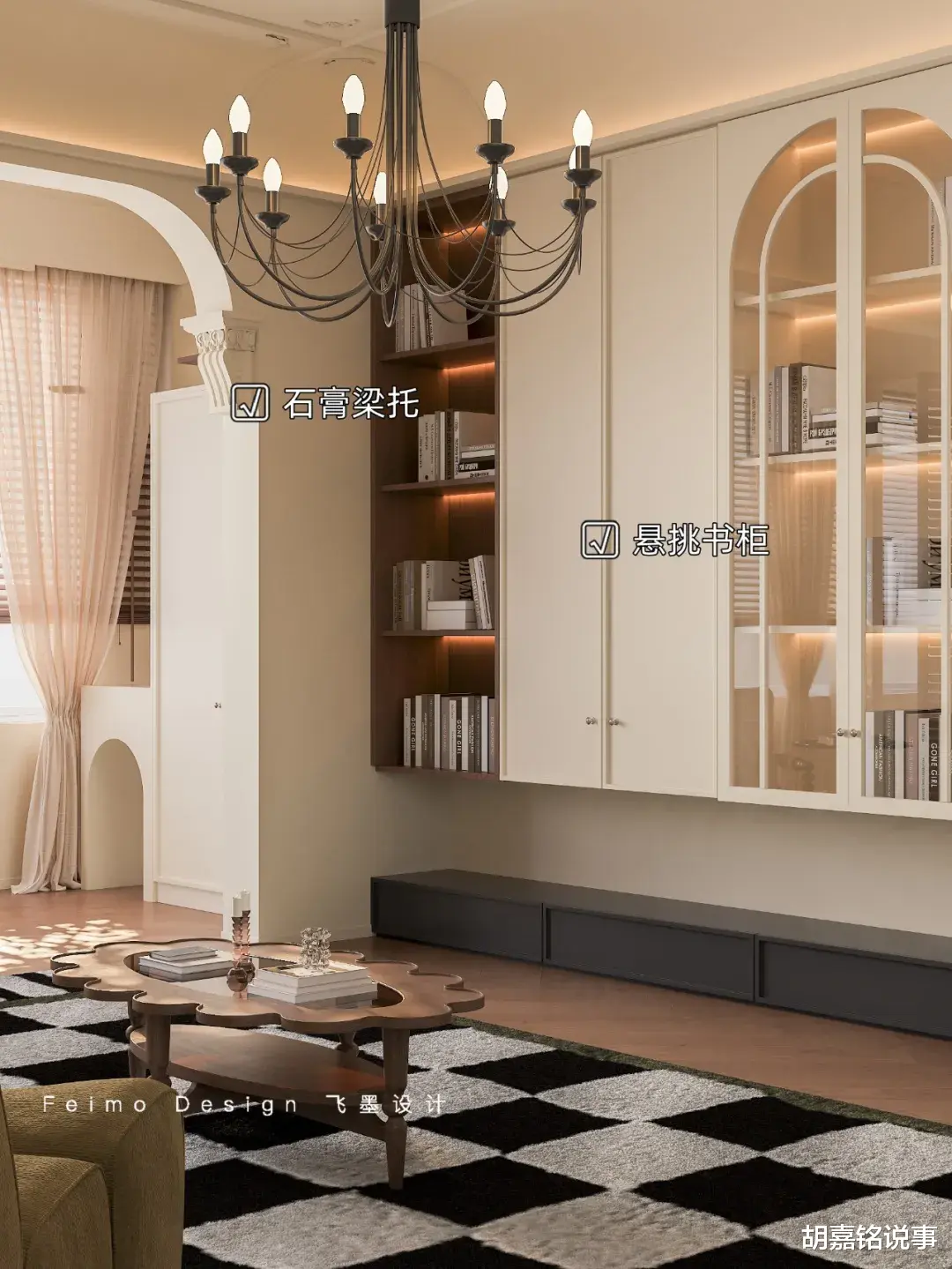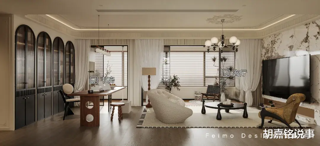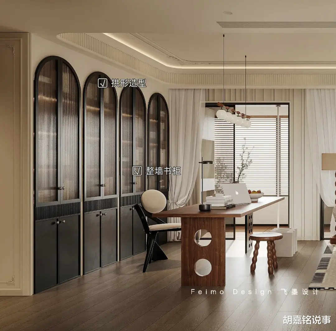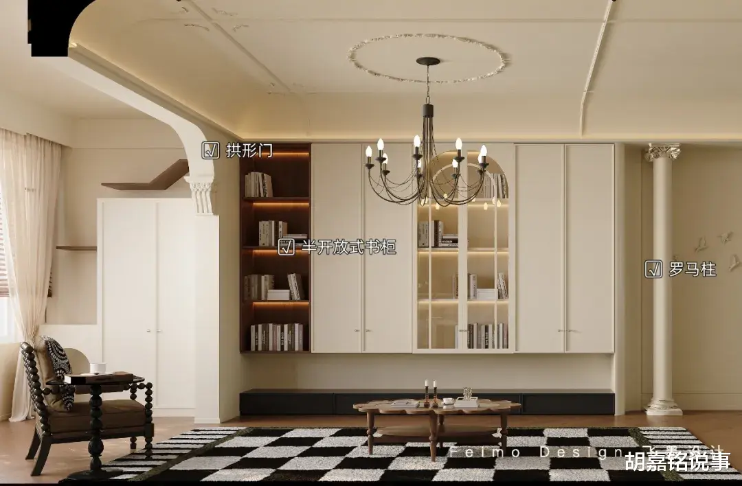 ③沙发后方设计开放式阅读区,定制拱形柜体,增加书桌,可以满足一家人的阅读需求。