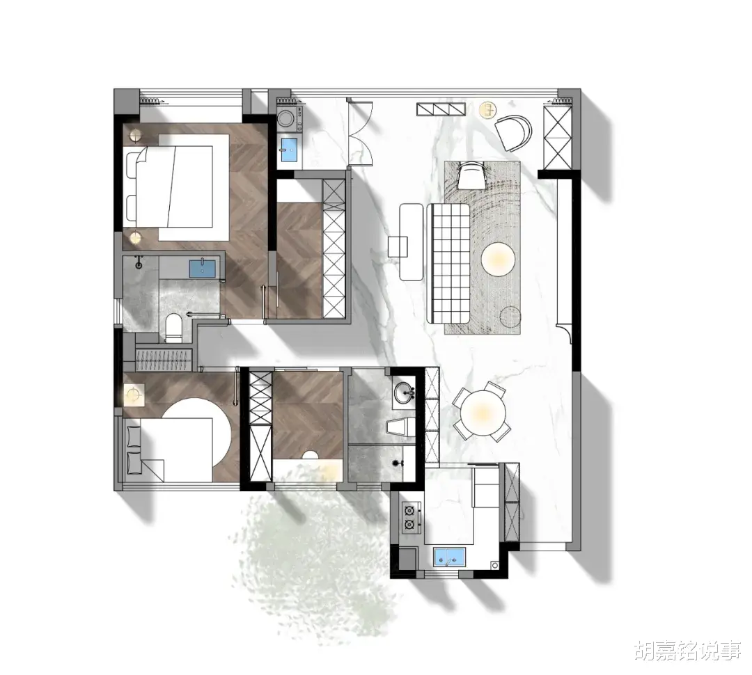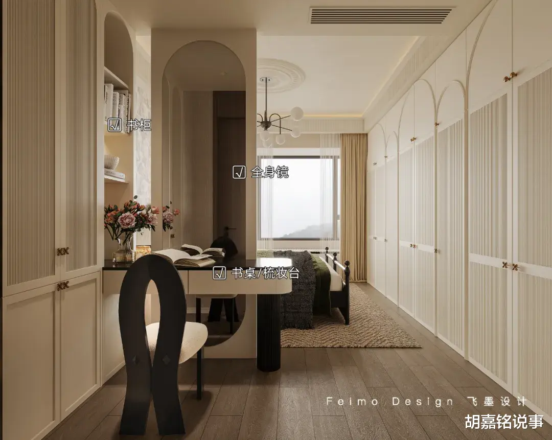 ④主卫与床之间设计梳妆台+隔断,避免卫生间门正对床的尴尬。