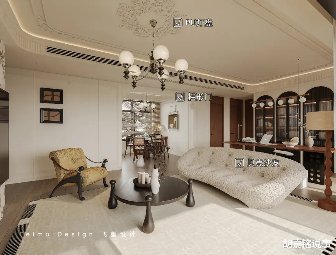 ③顶面设计石膏线+石膏灯盘装饰,增加法式精致感。