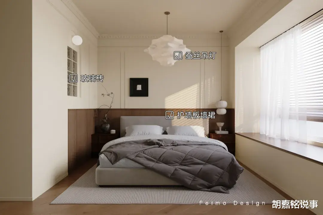设计亮点:①卧室与卫生间之间,嵌入玻璃砖装饰,提升空间通透度。②床头背景墙设计石膏线、护墙板墙裙装饰。