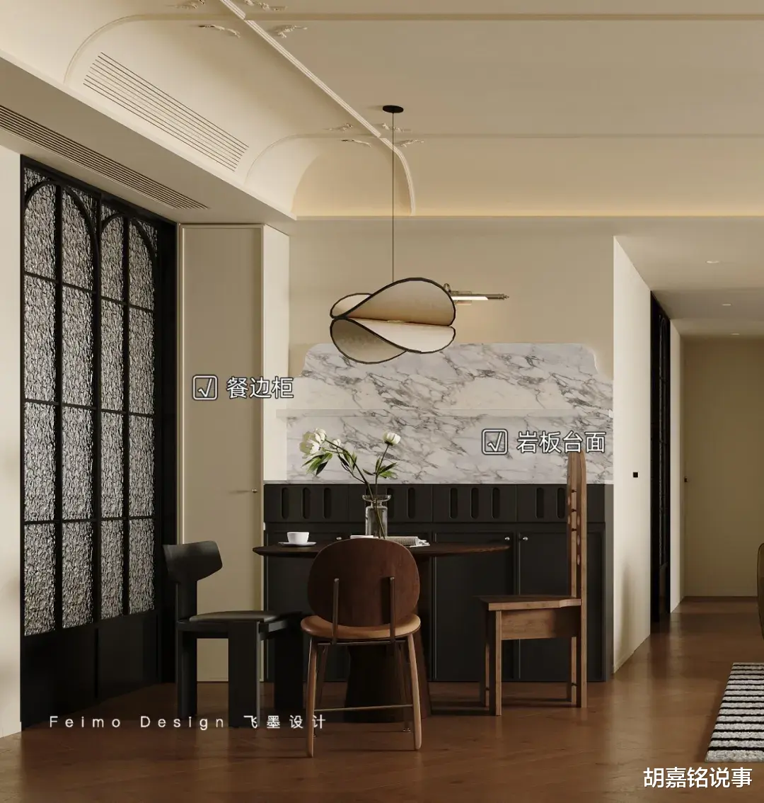 设计亮点:①餐厅选择圆桌,占面积小,容座率高。②靠墙定制餐边柜,结合岩板台面,兼顾实用与质感。