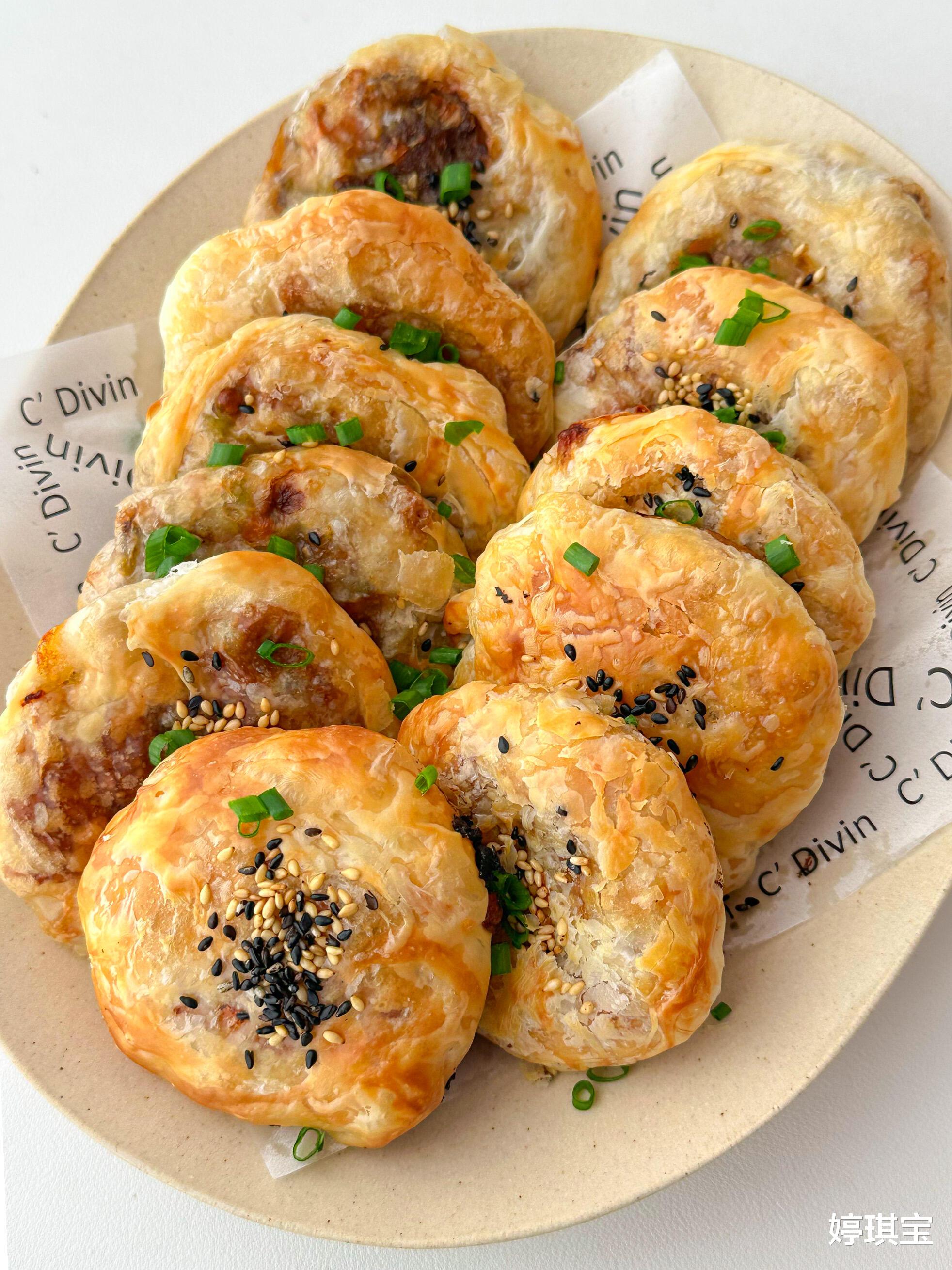 面团擀成长方形,折叠三次形成层次。分剂子擀圆,包入馅料像包包子般收口,轻轻压扁。
