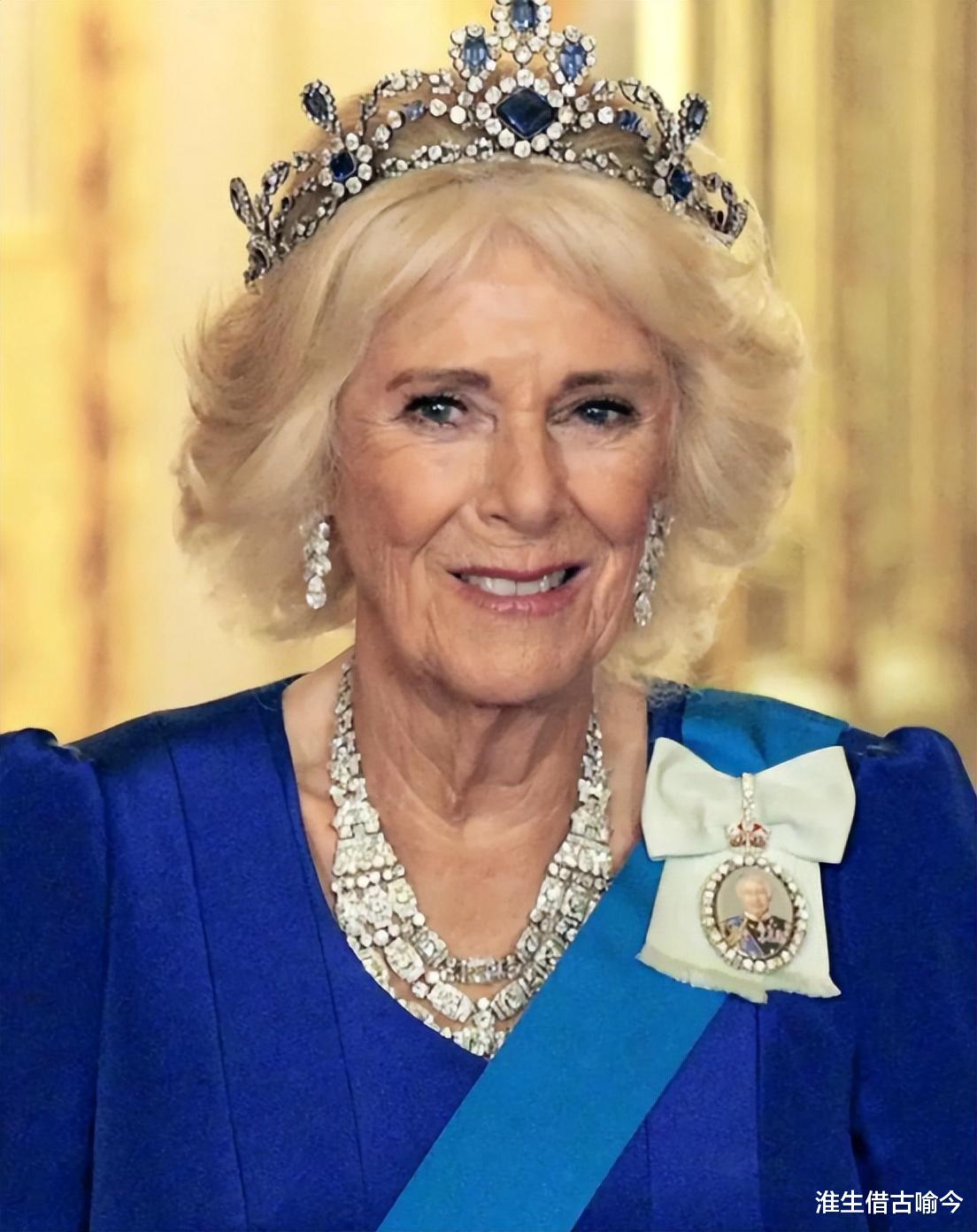 在珠宝配饰上,卡米拉这次更是下足了功夫:颈间挂着格雷维尔五排钻石项链,头顶戴着比利时蓝宝石王冠,宝石色泽与衣料配色完美呼应。