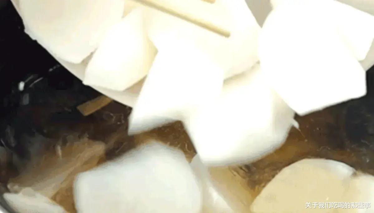 时间到了,把扎孔的白萝卜取出,葱取出,再放入切块的白萝卜,继续小火炖十到十五分钟。