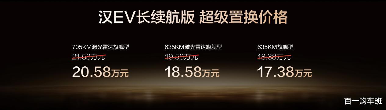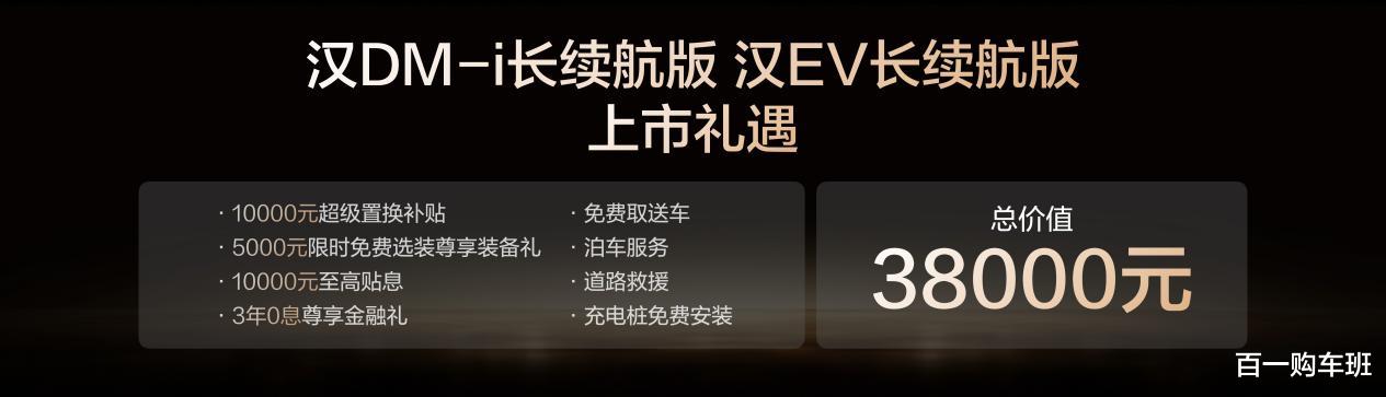 此次,汉DM-i长续航版共推出4款车型,补贴后售价15.98万~18.98万元;汉EV长续航版共推出3款车型,补贴后售价17.38万~20.58万元(10月31日前完成购车可享1万元超级置换补贴)。同时,比亚迪还为用户准备了包含置换补贴在内的至高价值3.8万元七大礼遇。