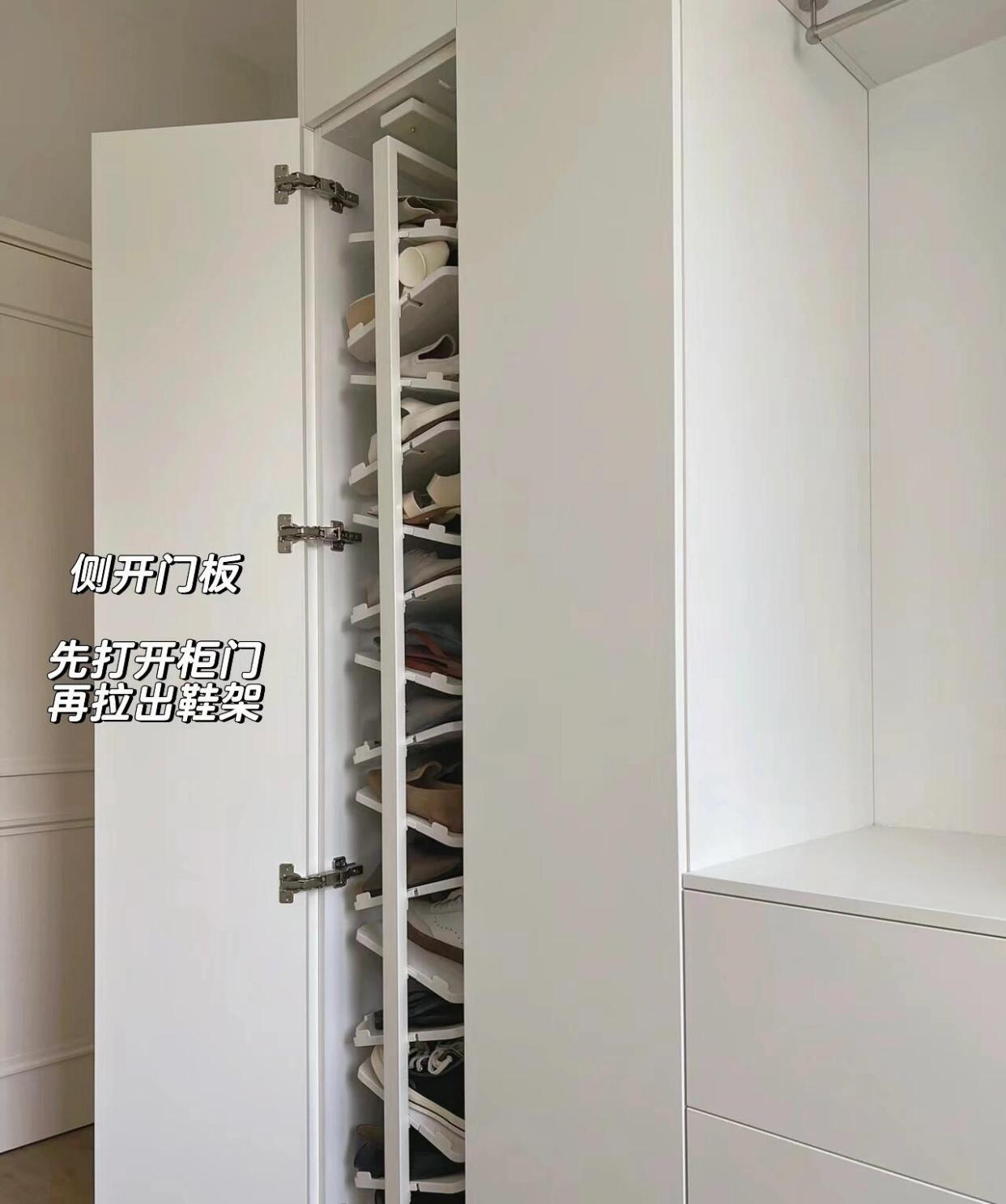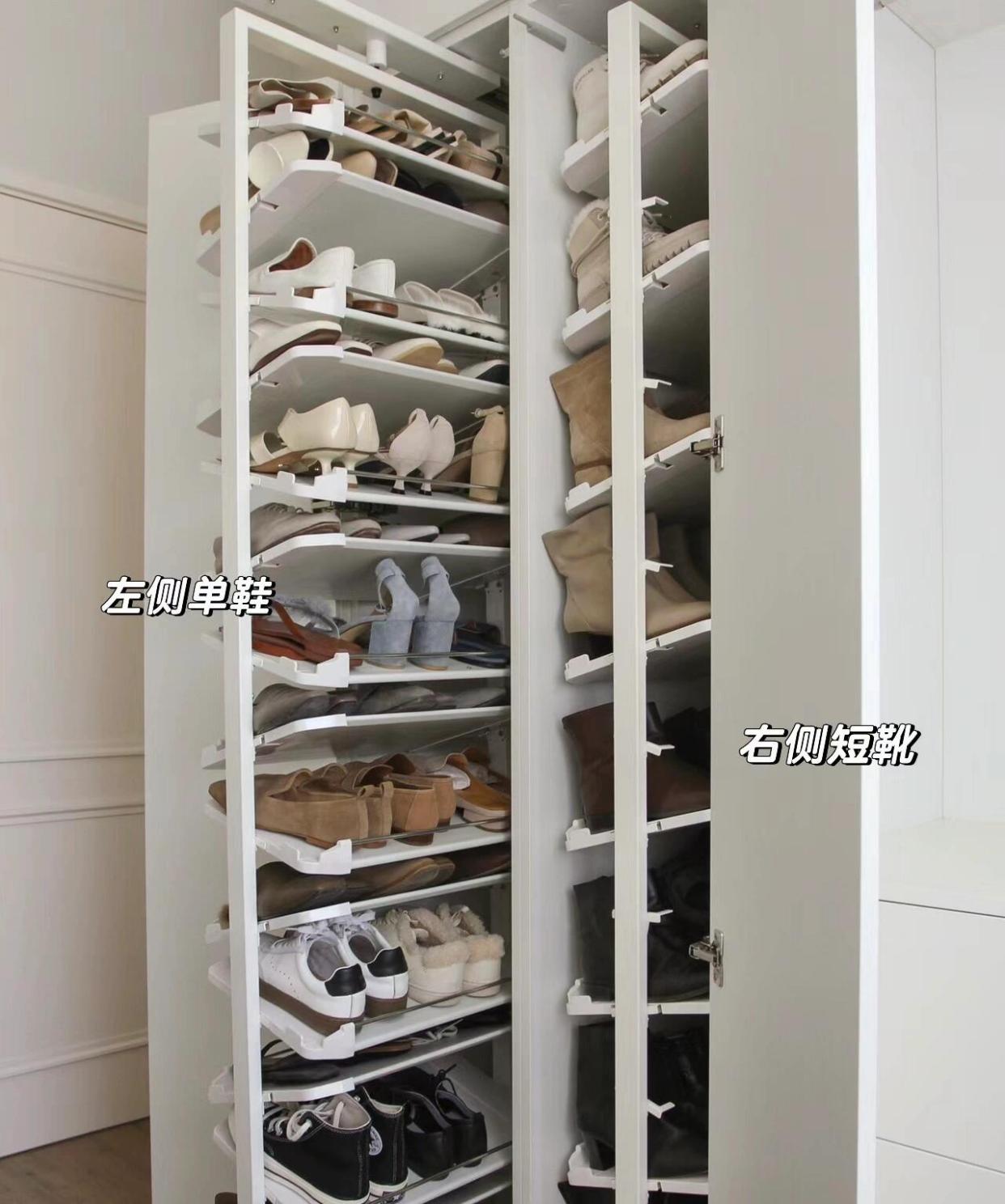 也可以学网友@Linda:柜内安装鞋架,因为鞋子本身有坡度,倾斜摆放能够最大化利用空间。鞋架内的层板可以拆卸,坡度也可调节。每层可摆放 2-3双鞋子,收纳靴子时拆卸掉部分隔板就行。