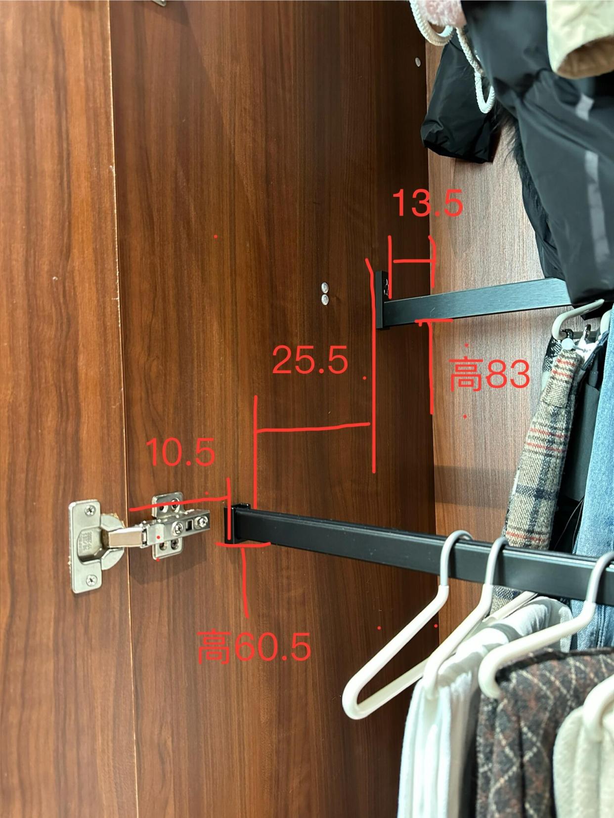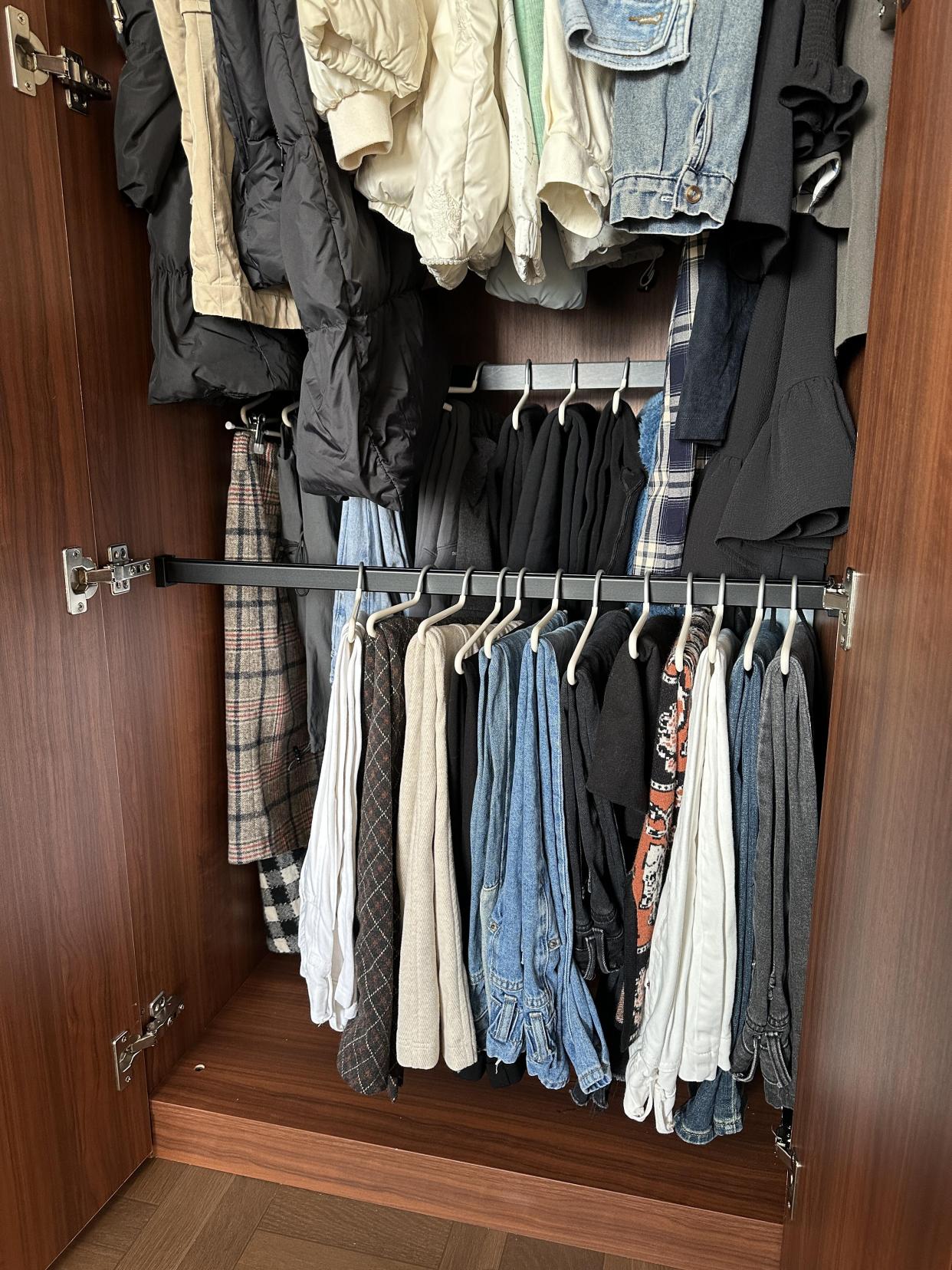 挂杆位置太深的,装双排裤架真的好好用,外面挂日常穿的普通长裤,里面挂一些不常穿的裤子或裙子,超级好用。