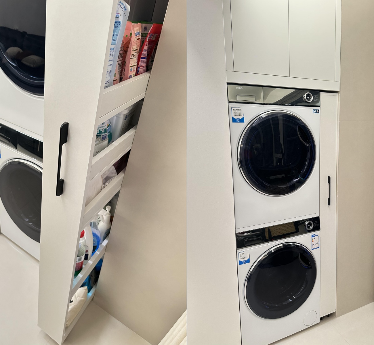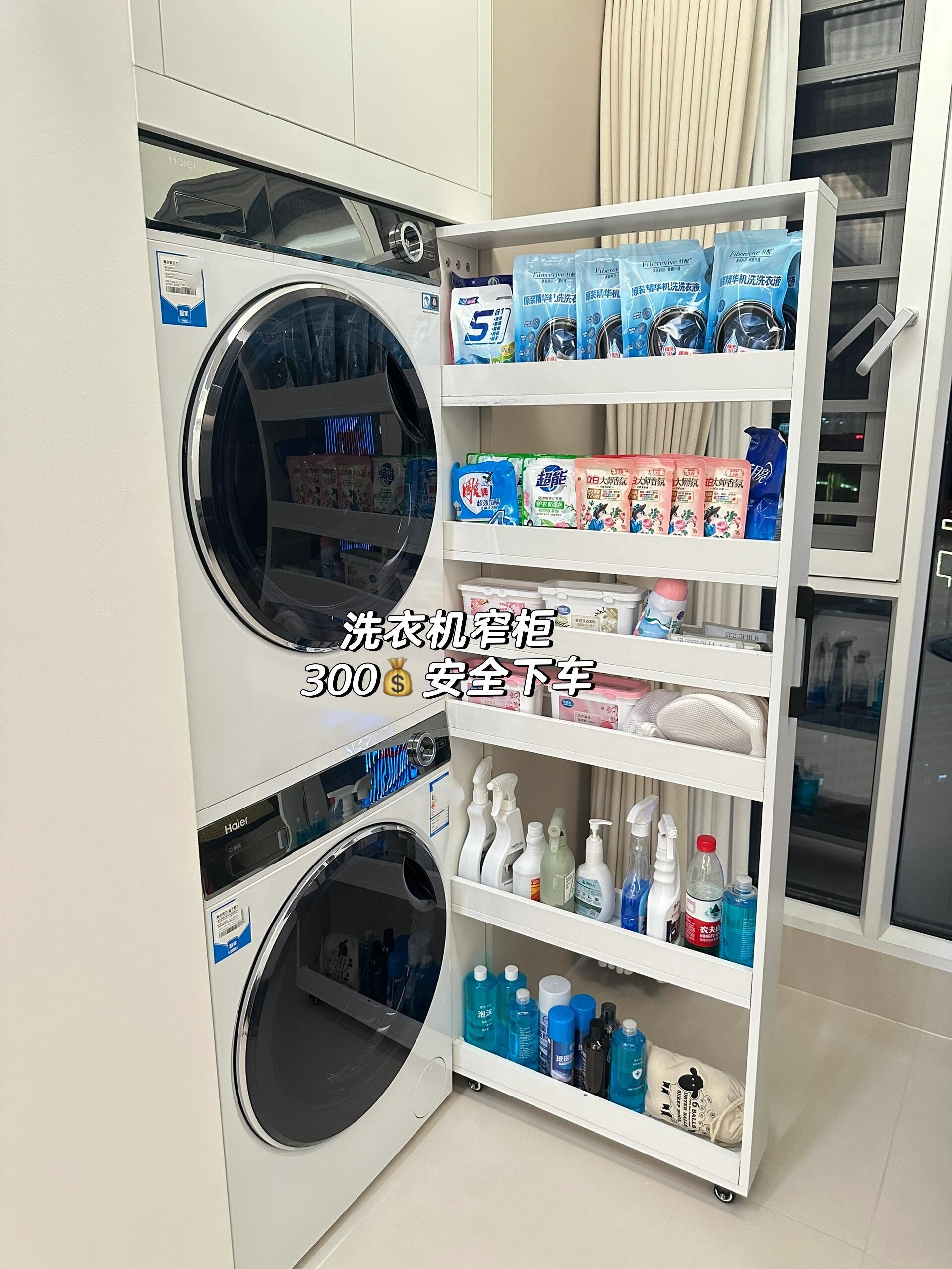 如果洗衣机旁边剩下一个缝隙,还很深的,可以学网友 @小b在装修 家这样,14cm宽的缝隙,在网上定制一个超窄柜,用来放洗衣液、清洁用品,随手可推进拉出,很方便。