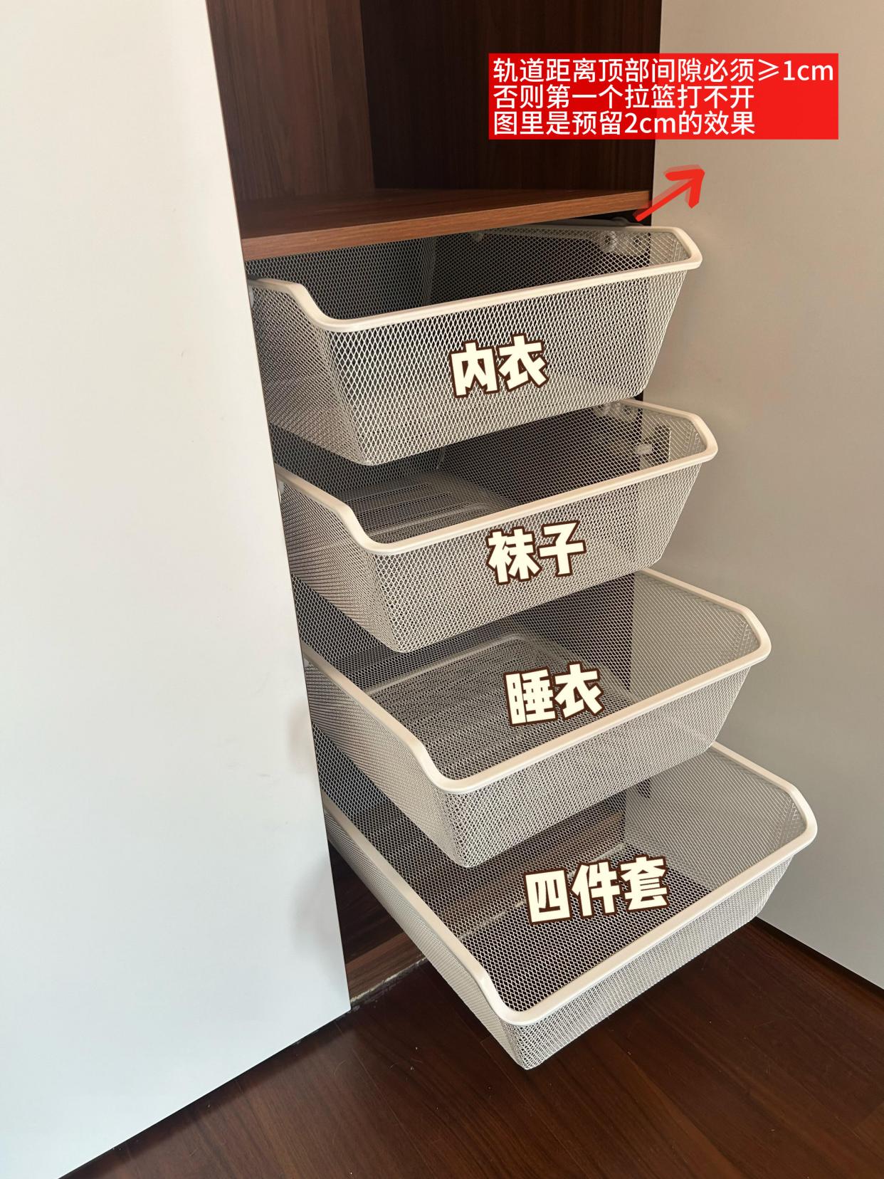 也可以找合适的拉篮装上,有不同高度不同密度的网篮,安装也简单,衣服都叠好放进拉篮里。