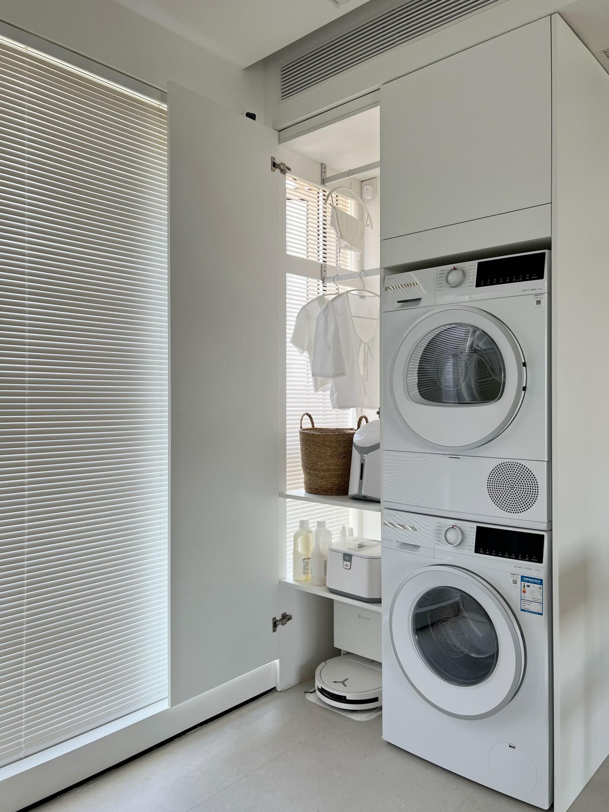 @青野啊:洗衣柜侧边前期做窗户时就把这里设计成可打开的窗扇,洗烘套装旁边的柜子设计成晾衣区,在顶上安装抽拉晾衣架,手洗的少量衣物可以在这晾晒。