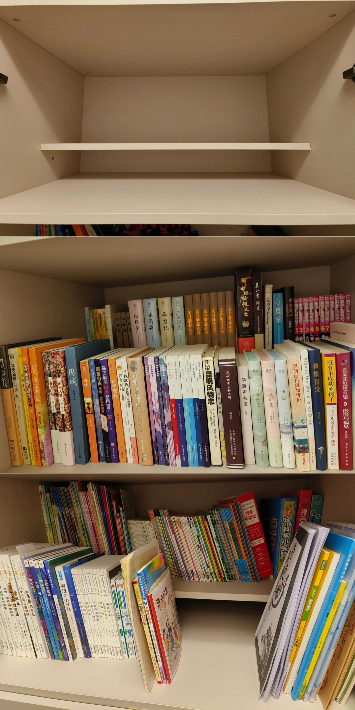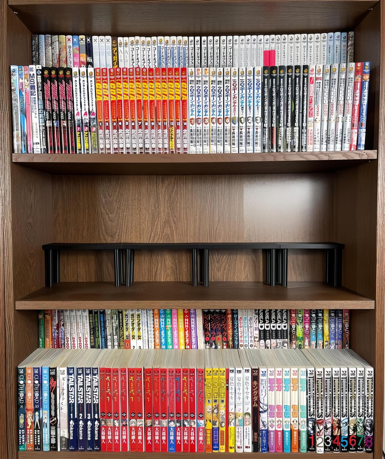 实际上,如果装修做衣柜书柜一体,书柜做得太深,且刚开始没考虑错层设计的,也可以在里面放一个支架,就可以叠起来放,效果也不错。