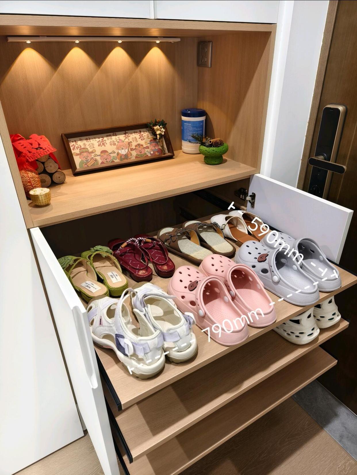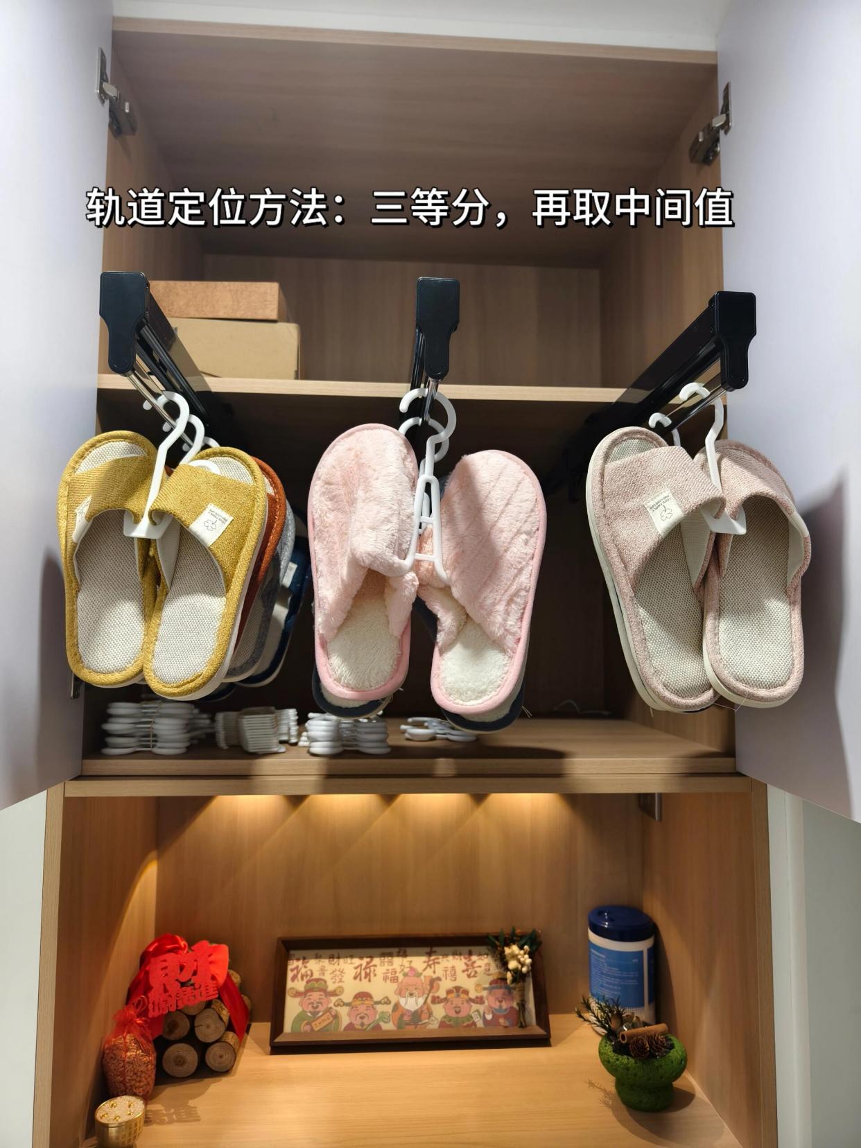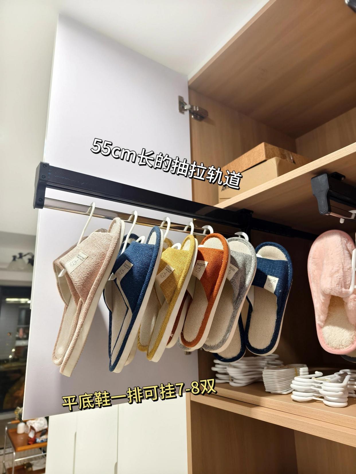 上柜下层,手一抬就能够着的一格,安装抽拉轨道,搭配挂鞋架,一排就可以挂七八双鞋子,底部空的位置还可以放薄薄的收纳盒,放鞋套等物品。