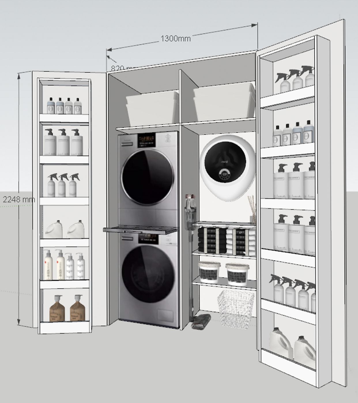 中间层板可以放脏衣篓及内衣裤洗衣机,收纳洗护用品。