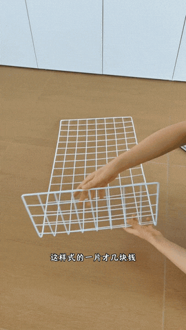 首先根据柜内尺寸网购一片式的网格片,一片才几块钱,没有对应的尺寸就往大的买,多余的尺寸可以弯折组合。把网格片弯折成自己想要的尺寸,预留好开口的高度,然后用扎带固定好组装起来。
