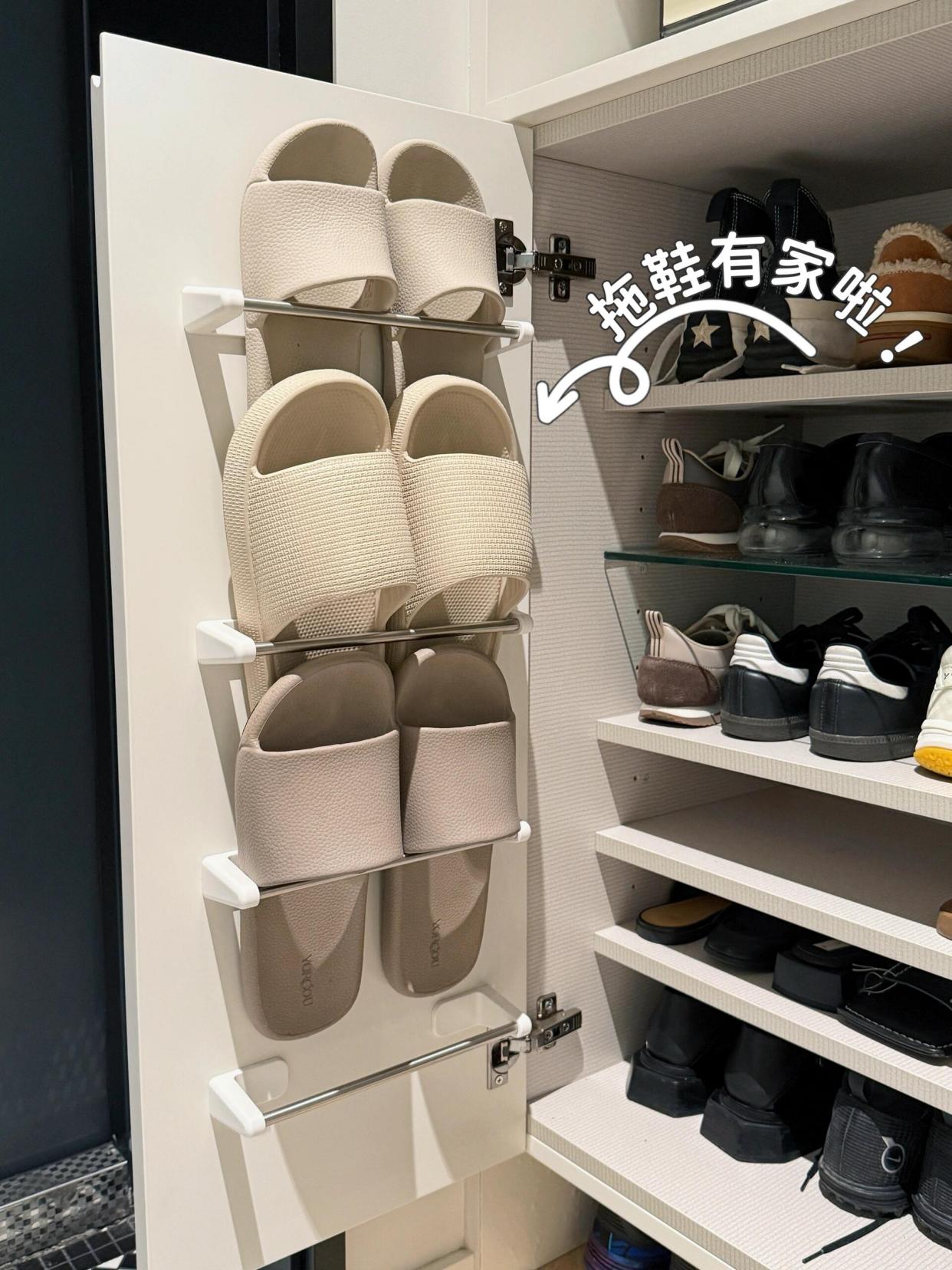 若是鞋柜有40~45cm深,放下鞋子还有空间浪费,可以将层板内退10~12cm,这样门板上就能用来收纳拖鞋了。