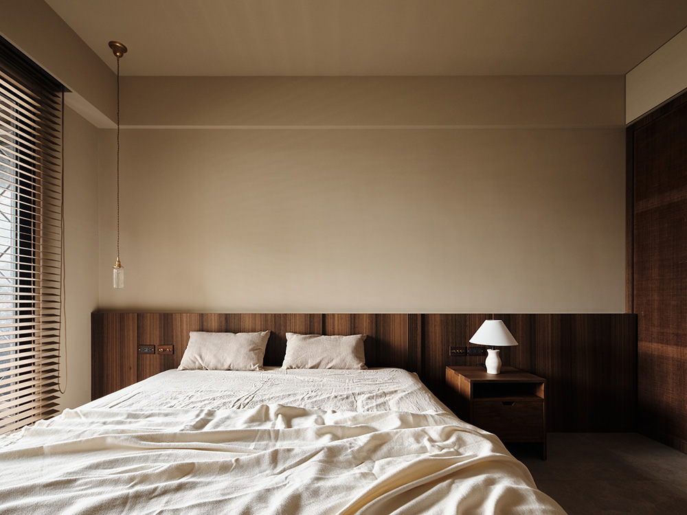主卧房门涂上与客厅主墙相同的特殊涂料,蔓延出和谐的一致性,房内以低彩度的内敛朴韵勾绘睡卧情境,隔绝外在喧嚣,赋予个人私领域的放松缓调。