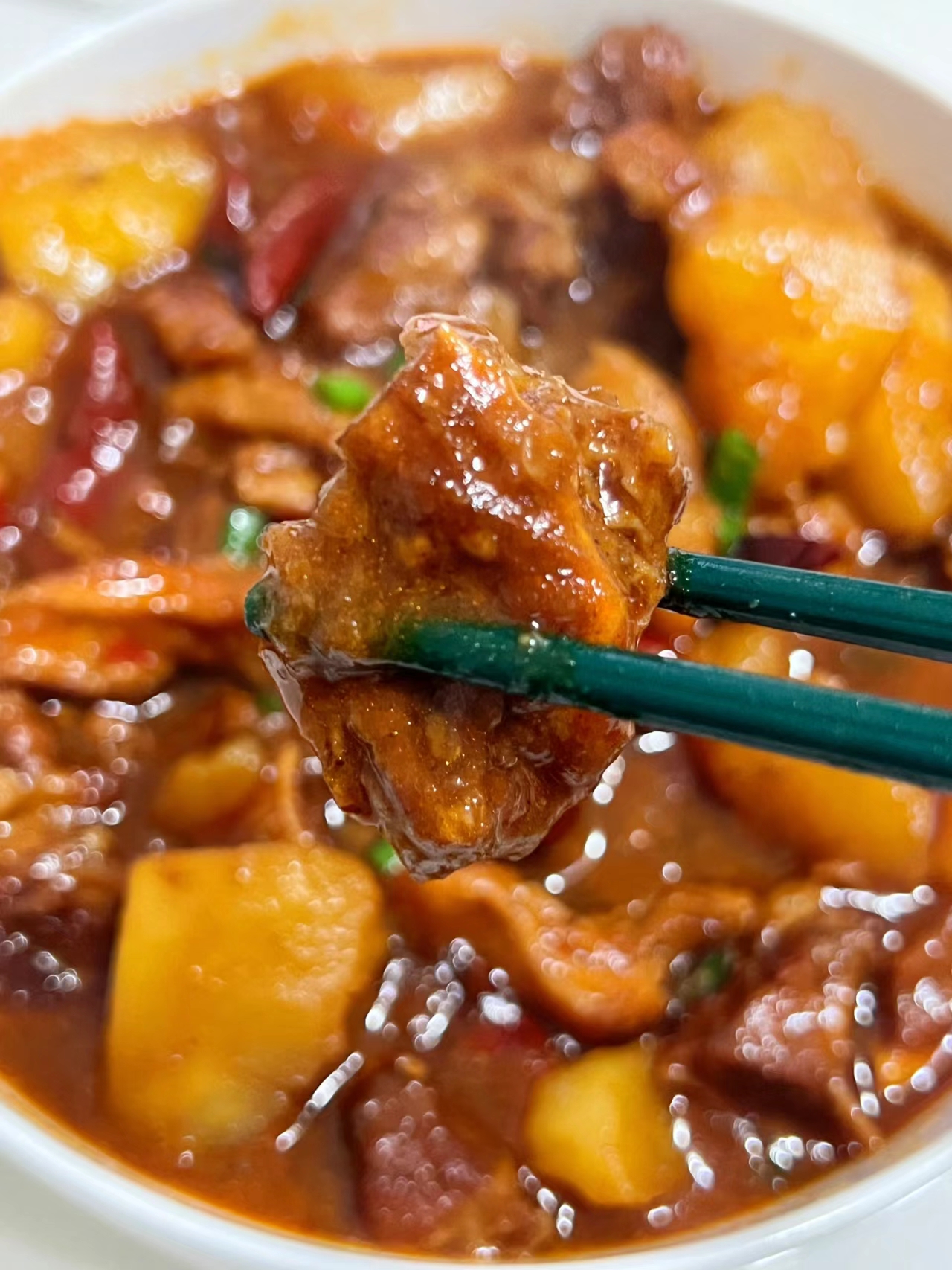 - 牛肉基本熟透时加入土豆块,继续小火炖煮,直到土豆变得软糯。