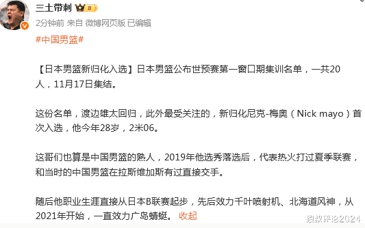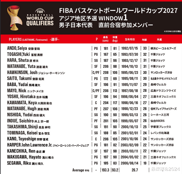 北京时间11月5日,根据日本篮协公示,日本男篮公布世预赛第一窗口期集训名单,一共20人,11月17日集结。此前被公牛裁员的河村勇辉并没有出现在集训名单,而与亚洲杯时期相比,渡边雄太回归到日本男篮集结阵容。