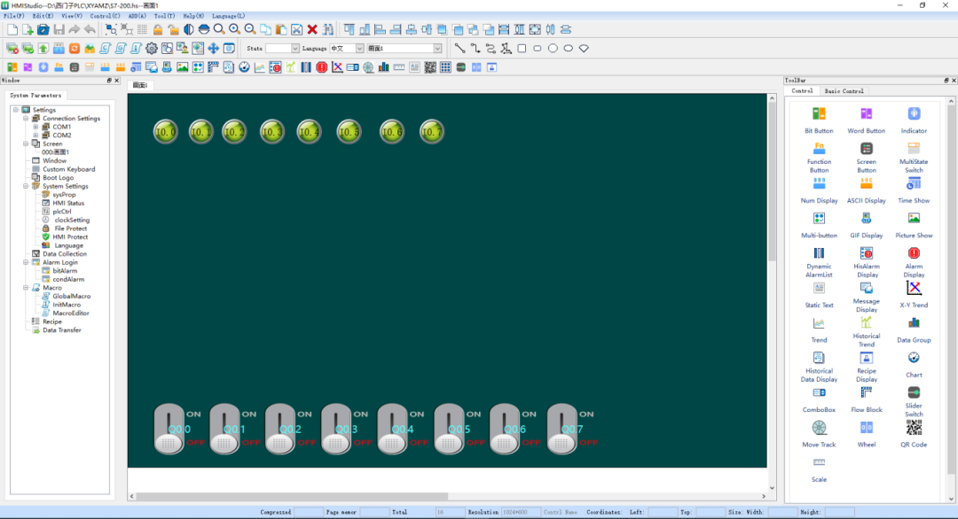 3、一站式集中控制:支持触控操作,通过屏幕上的虚拟按钮、开关和滑块,即可直接操控PLC、下位机、传感器、电机等,完成对设备的启动、停止、参数调整等所有操作,告别繁杂的物理按键。