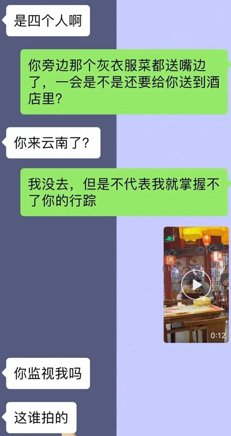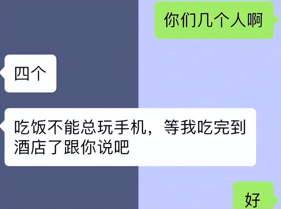 今天男主我们就称为“阿福”,女主就称为“阿草”吧,阿草到了所谓的出差地后告诉阿福说快饿死了要跟领导吃饭,阿福关心的问阿草吃的什么,阿草随手发过来一张照片:
