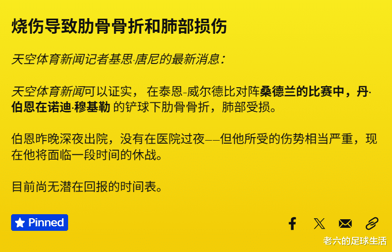 这场德比战的失利给纽卡带来了很大的打击,而且更糟的是球队的主力中后卫丹·伯恩在比赛中被铲到肋骨骨折,受伤严重,接下来的比赛是无法出战了,这下纽卡的后防线只剩下四名一线队球员了。