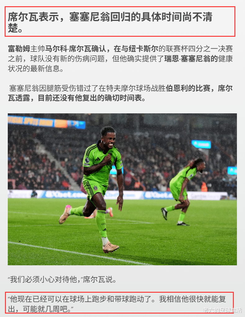 富勒姆这边球队的伤病情况要比纽卡好的多,目前缺席的球员穆尼兹跟赛赛尼翁是老伤病了,现在赛赛尼翁已经开始进行个人训练,距离他回到赛场的日子也不远了。