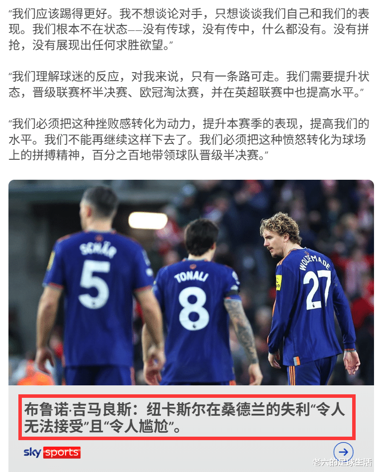 纽卡斯尔联这边上场与桑德兰的德比战遭到落败,而且是以沃尔特马德打进乌龙球的形势送给桑德兰期盼了十年的顶级联赛德比复仇。