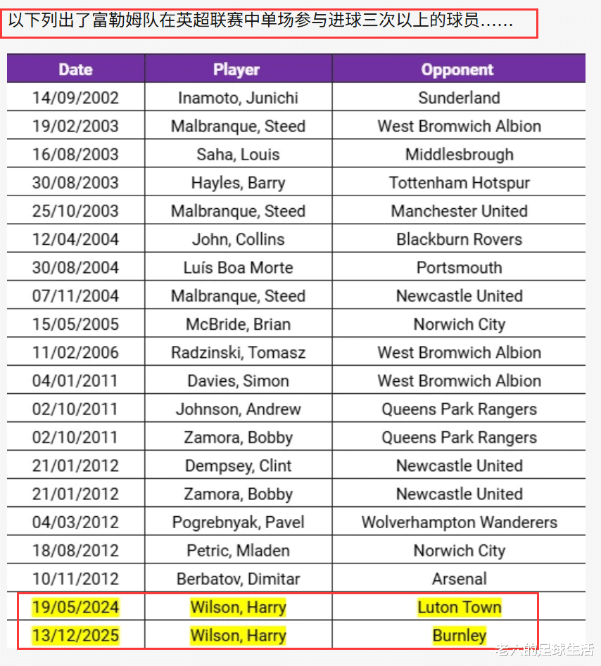 上场比赛边锋威尔逊延续了自己出色的表现,贡献了一粒进球和两次助攻,要知道自从2012~13赛季以来,已经有十多年没有球员在比赛里参与帽子戏法了,这支球队建队以来也只有16名球员完成过单场比赛参与3次进球及以上,威尔逊在上赛季也完成过一次。