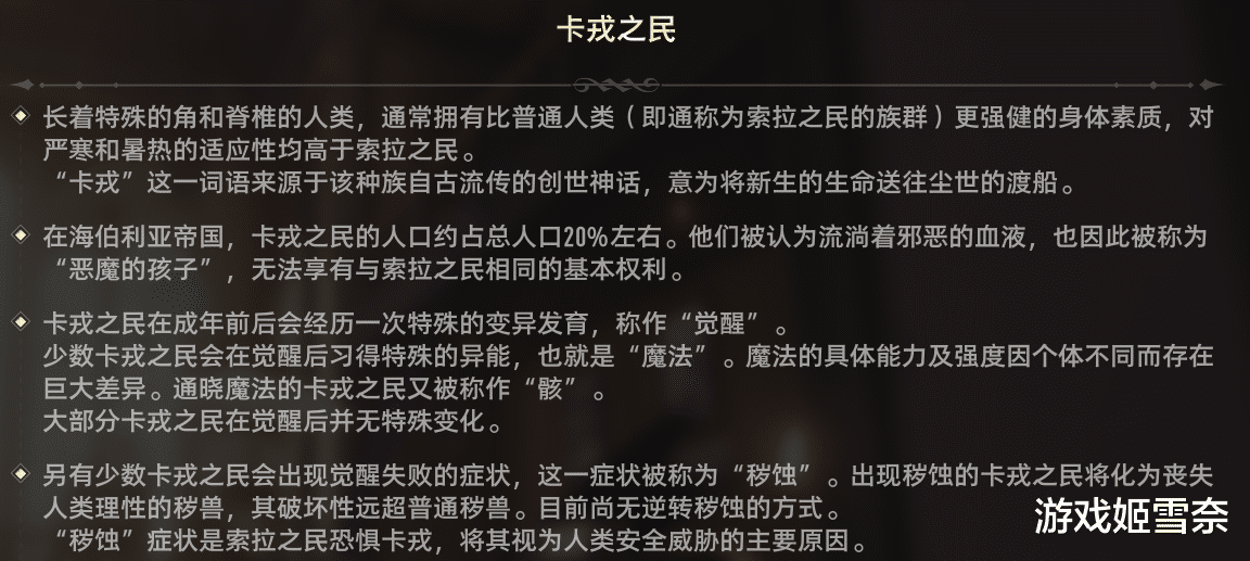 头顶有角的卡戎天生拥有比普通人更强的体魄,也拥有学习魔法的潜力,但卡戎之民在成年前会有一次特殊的变异发育,少数卡戎会在觉醒中获得强力的魔法异能,这样的卡戎被称作“骸”,其魔法的能力强度每个个体都有巨大差异,大部分卡戎变异后无特殊变化,另有一小部分卡戎会觉醒失败,化为失去理智的强大破坏性怪物。因此卡戎之民的“骸”是好战的帝国手中的必争兵器,又因为卡戎可能会变为怪物在帝国受到严厉管控,在民众发酵的恐惧和帝国有意控制的舆论下,卡戎之民被称为“恶魔的孩子”,在这个世界出生就是有罪的,地位卑微至极。