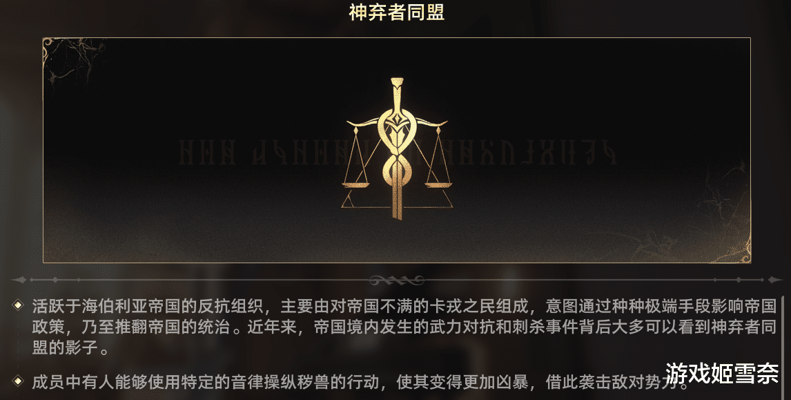 可想而知卡戎这个种族在帝国的冰天雪地下生存多么艰难,来到冰湖城遇见的少女玛尔洁,在寒风下衣不遮体,生活只能靠翻人类的垃圾桶,在这样的环境下卡戎之民往往选择抱团取暖,神弃者同盟便是卡戎中不甘命运反抗的团体,带着愤怒与仇恨尝试向人类复仇,然而这样做的处境只是让城内的卡戎们更加被人唾弃罢了。