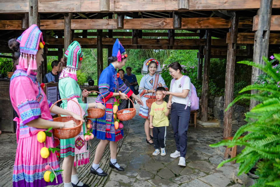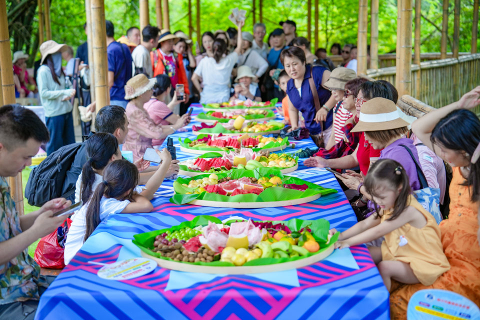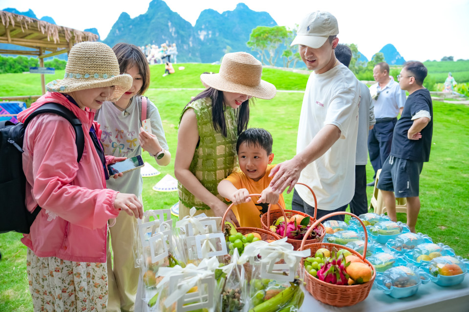 本次活动以“侬峒丰收”为主线,推出多项文化体验内容。游客可欣赏壮乡风情汇演,参与百果仙子巡游互动,体验具有非遗元素的“侬峒水果盲盒”,还可品尝由本地鲜果打造的长桌百果宴,感受“水果自由”的丰收喜悦。活动现场还设有壮乡水果市集、水果主题打卡点等互动场景,将民俗文化与自然景观巧妙结合,营造出沉浸式的壮乡生活氛围。